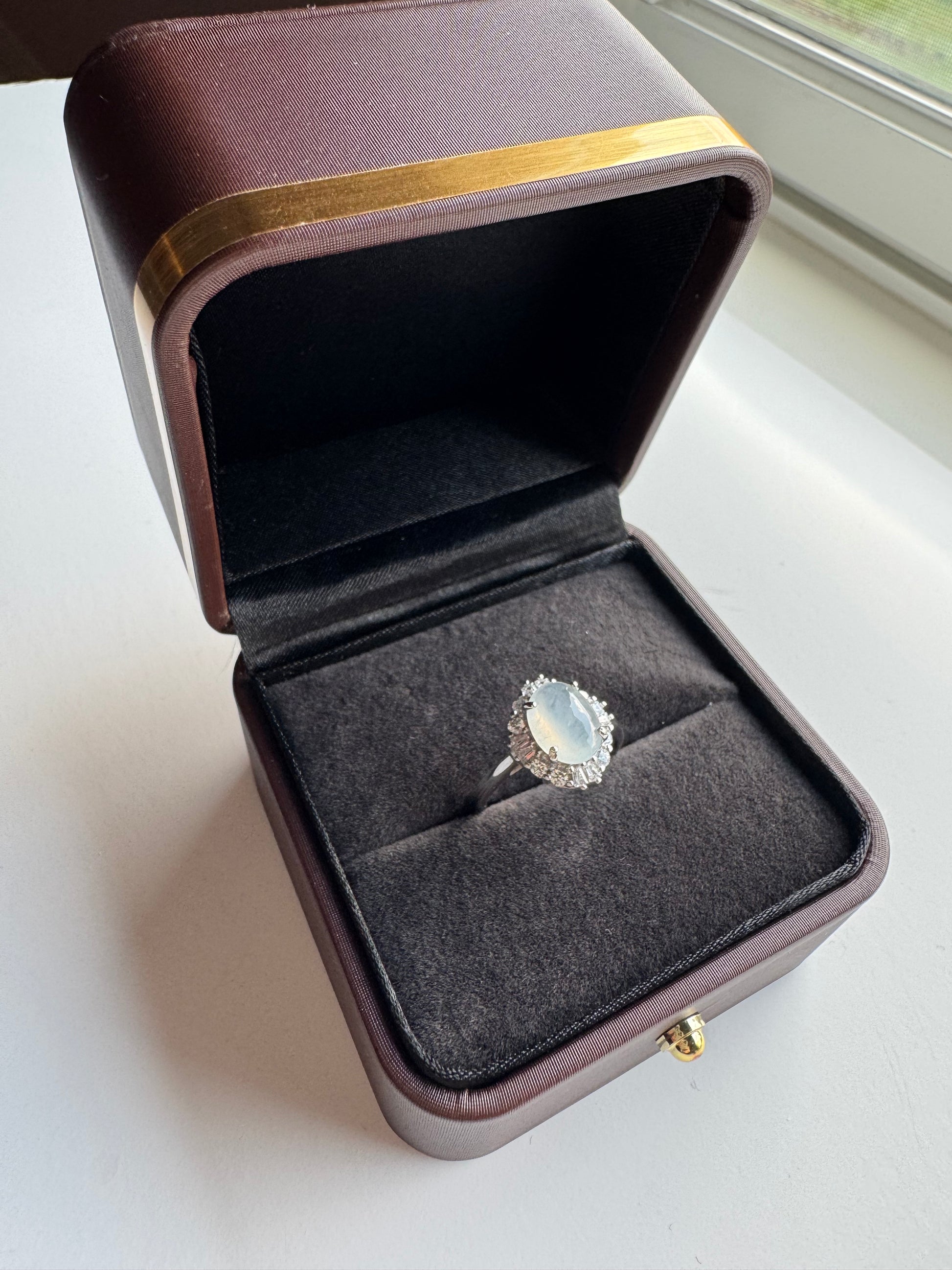 18K White Gold Icy Jade Cabochon Jadeite Jade Ring with Diamonds